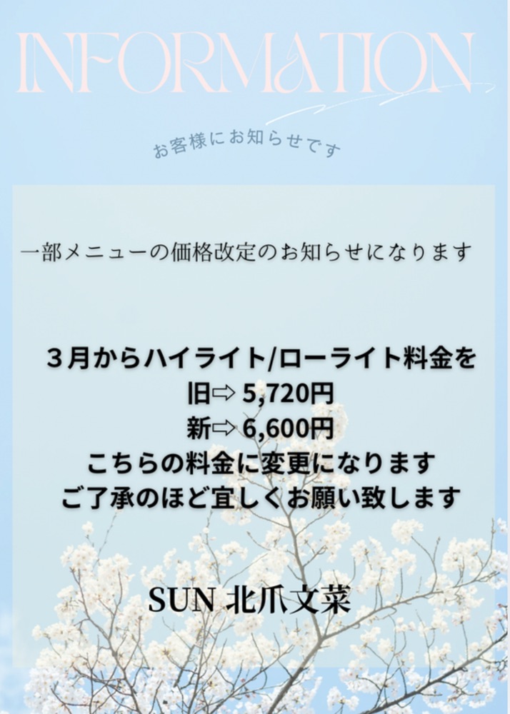 2026.01.30 一部メニューの料金が変更致します . こんにちはSUNスタイリスト キタヅメアヤナです🌞 カラーメニューの中の ハイライト、ローライトメニューの料金が3月から変更になります。 宜しくお願い致します « next