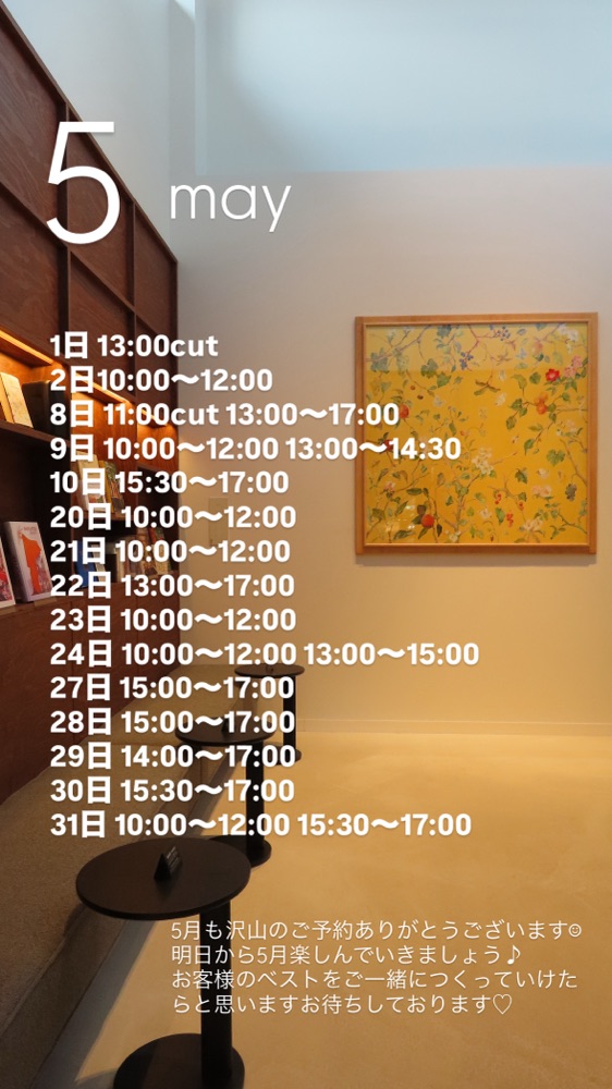 2026.04.30 5月も宜しくお願い致します . 4月も沢山のご予約ありがとうございました! 明日から5月、梅雨前にストレートのお客様も多くなります。 お待ちしてます、ご新規様はお電話にてお問い合わせくださいませ « next